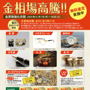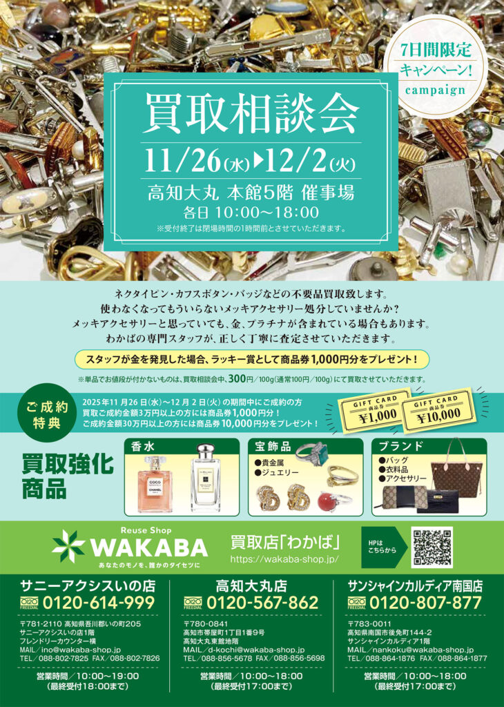 買取相談会のご案内 2025年11月12日 最終更新日時 : 2025年11月12日 deepecology 2025年11/26(水)~12/2(火)の期間、高知大丸本館5階催事場にて買取相談会を開催いたします。 詳しくはこちら